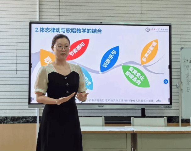本次讲座直面学校音乐歌唱教学中“技巧与情感失衡”的核心痛点。孙人君老师深入解析了达尔克罗兹教学法(以钢琴即兴、体态律动和视唱练耳为支柱),强调其旨在发展学习者的运动觉、内心听觉和即兴能力。她指出,“体态律动”是关键桥梁,将抽象音乐转化为可视肢体语言。结合专家观点(吴天球、高建进),孙老师阐明律动不仅是提升气息、发声等技巧的“技术辅助”,更是至关重要的“情感补充”,能帮助学生通过身体响应节奏、力度和旋律,深刻内化情感,实现技巧与表达的有机统一。讲座通过拆解体态律动在歌唱教学中的具体应用方面,为音乐师范生提供了极具操作性的方法论,破解其未来教学实践中“如何兼顾技巧与情感”的核心难题,有效提升其歌唱教学效能。