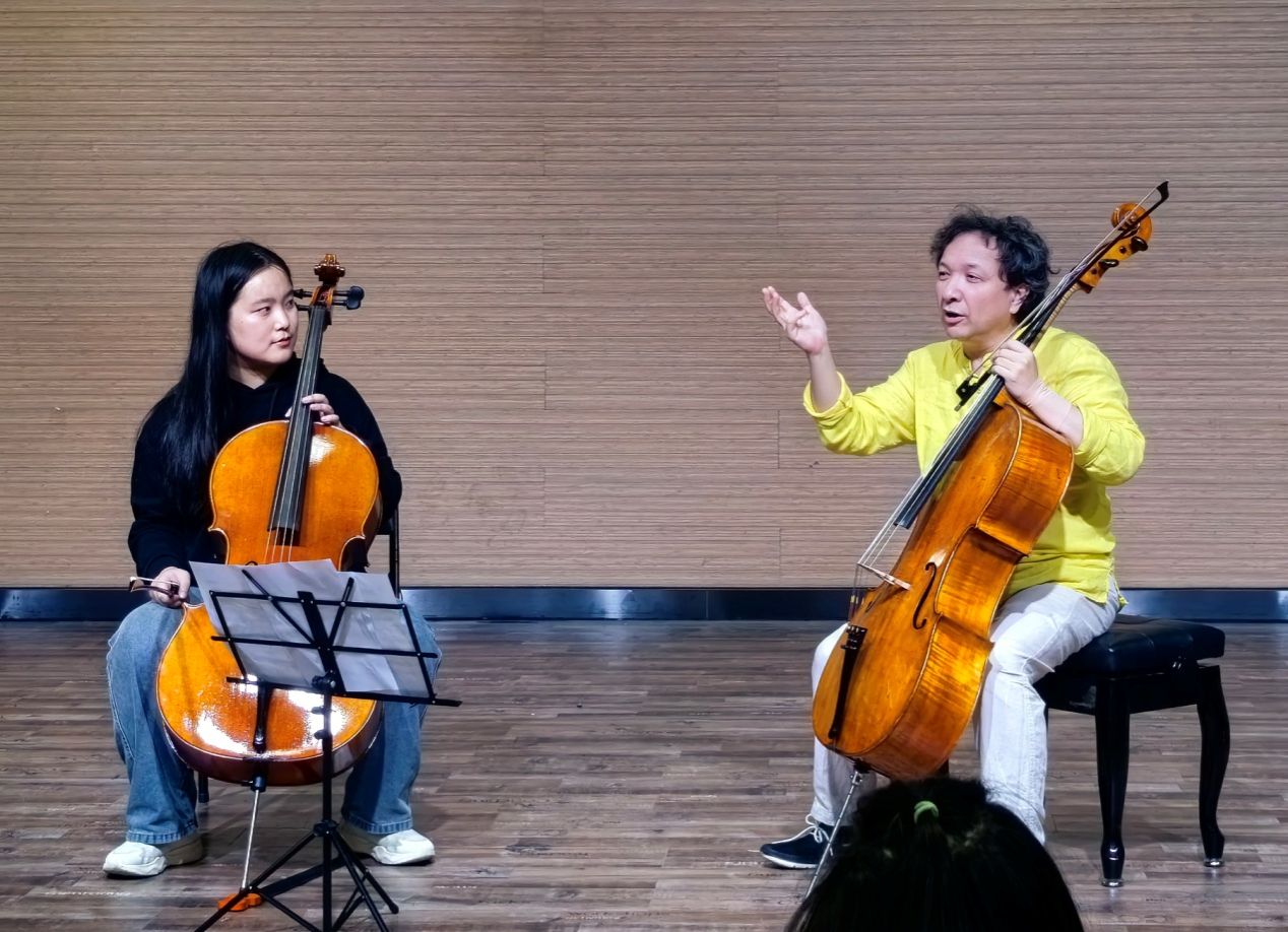 讲座采取了讲演结合的方式进行,朱亦兵教授通过为学生们的演奏进行指导与讲解为大家带来更深层次的音乐知识。此次讲座共有8名学生上台演奏,朱亦兵教授以作品的时代风格和大提琴演奏的基本功为切入点,从大提琴演奏的发音、运弓、把位等技术技巧方面延展至对于音乐风格及情感的处理,把自己通过人生经历和实践得出的对于音乐的深层次理解和演奏的进阶性技巧传递给在场的所有人。在长达4个半小时的讲授中,朱亦兵教授一直保持着高度的情绪能量和生动的讲课方式,通过示范向在场师生们进行了精准的音乐诠释。