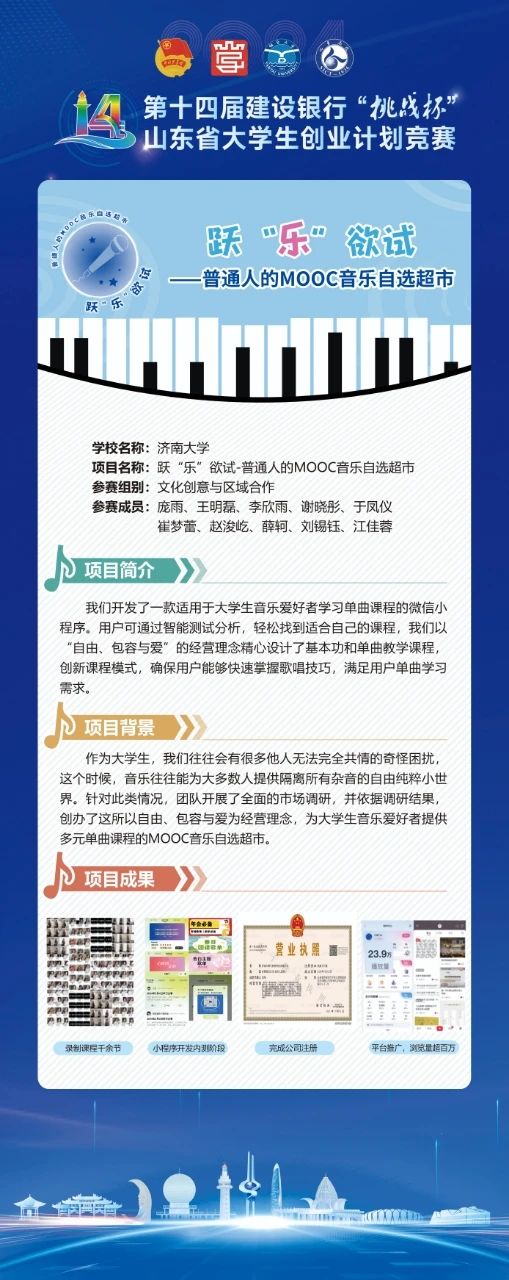 教师张爽婷、宋莉璐指导,学生庞雨、王明磊、李欣雨、谢晓彤、崔梦蕾、于凤仪、赵浚屹、薛轲、刘锡钰、江佳蓉完成的《跃“乐”欲试——普通人的MOOC音乐自选超市》项目斩获主赛道全国铜奖,创造了香港三级片