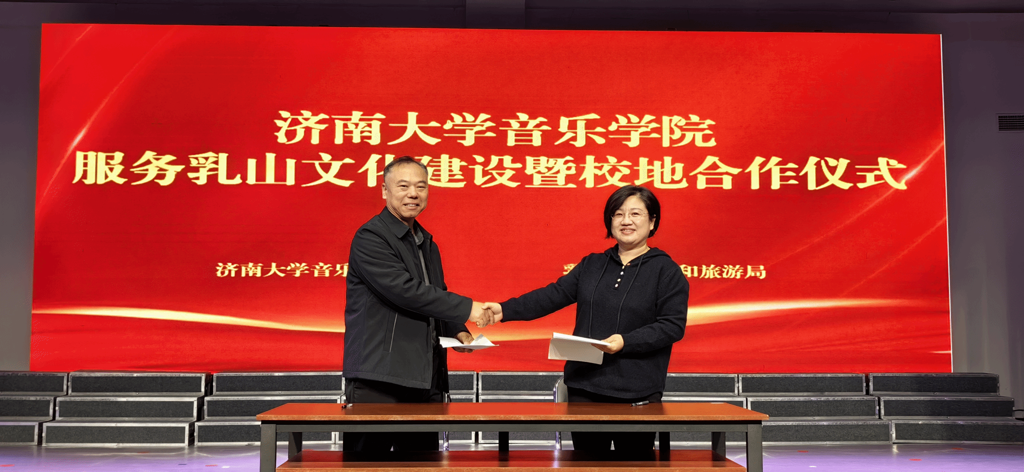 副院长王建成,乳山市文化和旅游局副局长、文化和旅游公共服务中心主任郑韶华、乳山市文化馆馆长韩波等参加仪式。王建成与郑韶华局长共同签署了合作协议书。