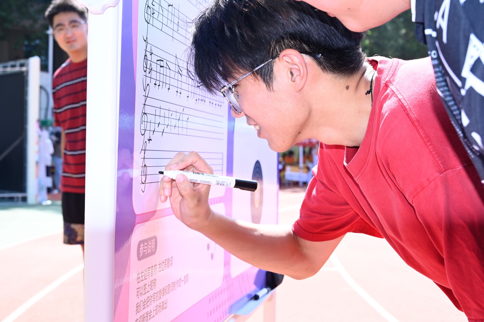 打造“指印·时光交响树”互动艺术装置,志愿者们热情引导,新生用彩色手印点缀枝丫,并写下第一段大学乐谱,共同创作属于2025级的音乐之树。