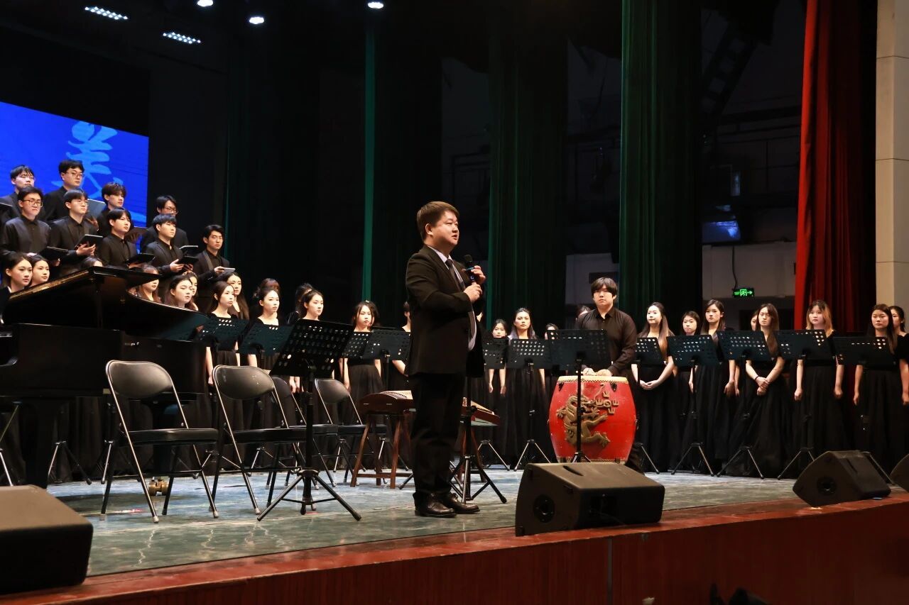 本次大讲堂由山东泉城合唱团常任指挥、山东省合唱联盟副主席田浩副教授担任主讲。田浩老师以其深厚的学术素养与丰富的舞台经验,从合唱的“声音融合”“情感共鸣”与“文化传承”三个维度展开,系统阐释了合唱如何将个体的“我”凝聚为集体的“我们”。他以《江城子·密州出猎》《郑风·子衿》等古典诗词合唱作品为例,解析了合唱艺术对中华优秀传统文化的创造性转化;同时,通过《如愿》《夜空中最亮的星》等现当代作品的演绎,展现了合唱与时代精神的同频共振。讲座中,田浩老师强调:“合唱不仅是声音的艺术,更是集体的哲学、情感的共鸣。它教会我们在倾听中协作,在和谐中成就彼此。”