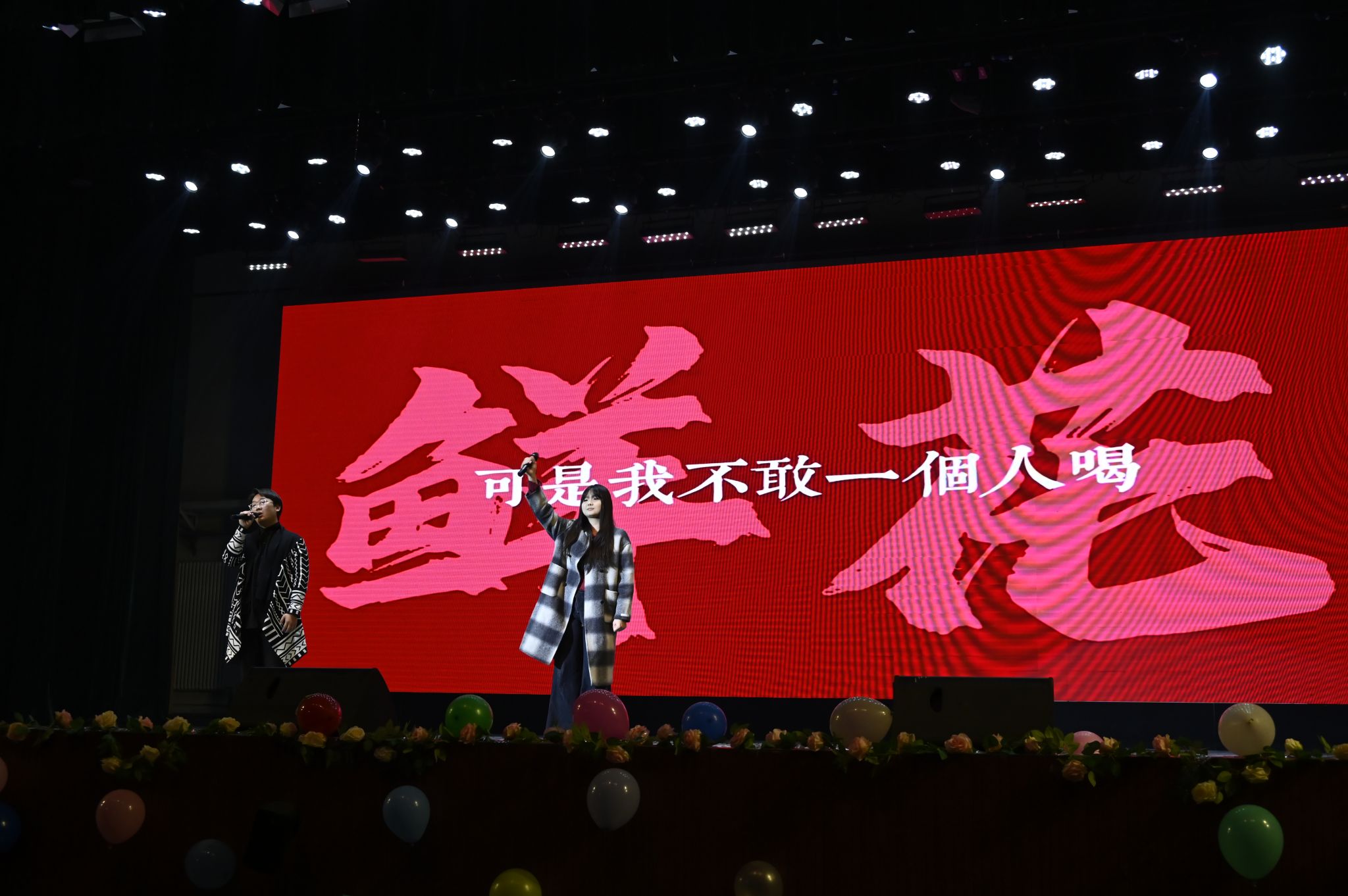 校院两级十佳歌手苏咏琪、时博演唱的回春丹乐队爆款歌曲《鲜花》,以温暖而深情的嗓音,唱响了对美好生活的热爱与对未来绽放的无限憧憬,二人高水平的演唱将会场气氛推向顶峰。