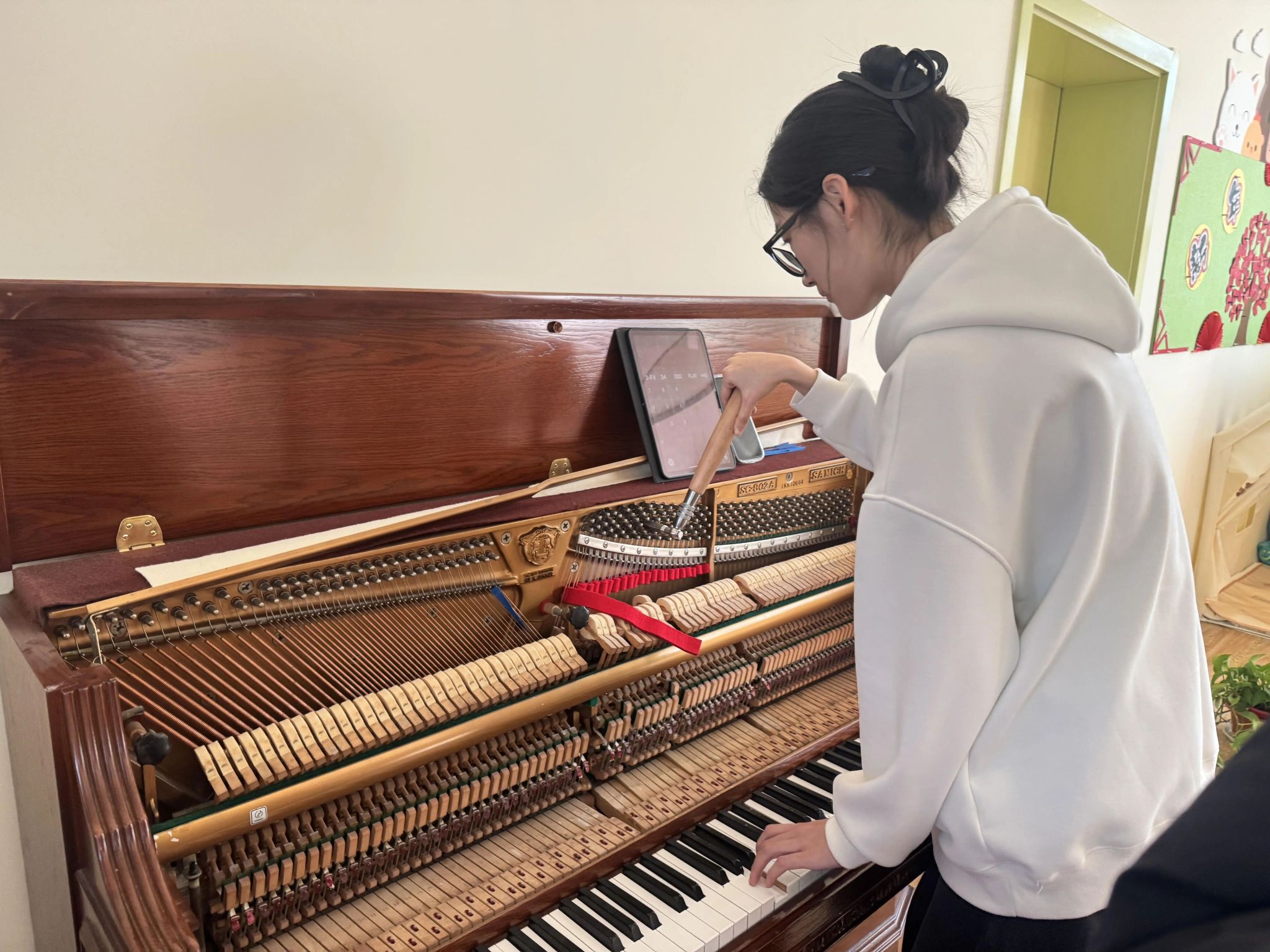 演出结束后,调律专业学生深入教室,为每台钢琴进行全面检测与精准调音;打击乐学生为儿童福利院春晚节目进行指导;带队老师则与福利院领导就美育实践基地建设、社会志愿服务等方面进行深入交流,并对双方共建实习实践基地、助力学生音乐梦想等议题达成初步共识。