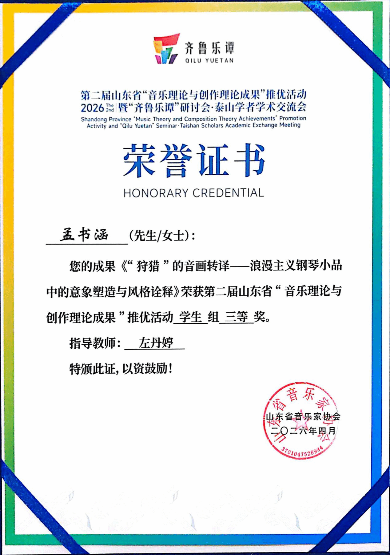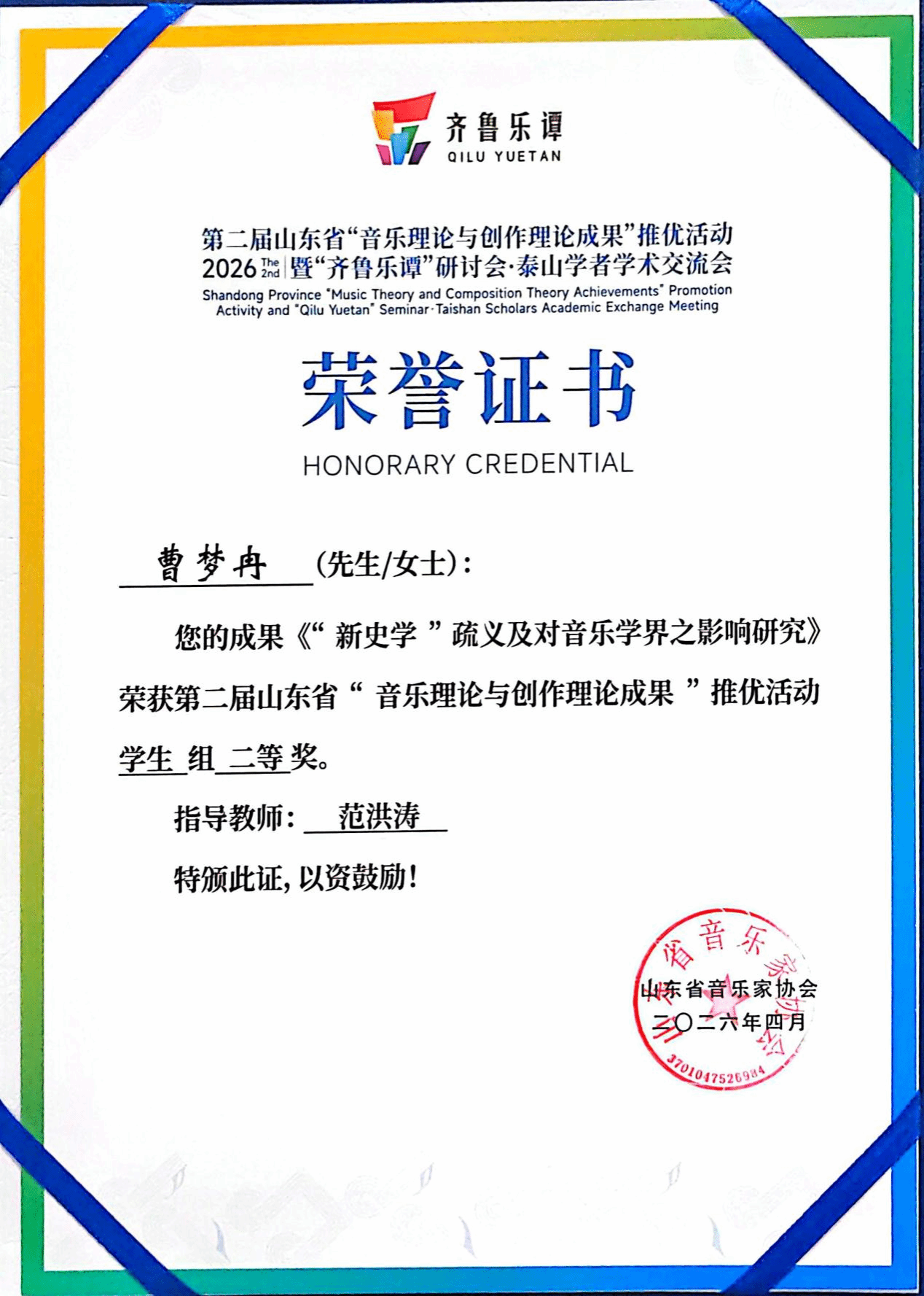 杨瑞教授的《压缩与延展:山东琴书的多模态转译与再生》获教师著作类二等奖;范洪涛老师的《〈朝鲜王朝实录〉所载世宗朝文庙释奠乐音乐形态研究》获教师著作类三等奖;王晓锋老师的《坠韵·弦吟》获教师组作品类三等奖;李季雨老师的《诗经·郑风·子衿》获教师组作品类优秀奖;音理2401班曹梦冉的《“新史学”疏义及对音乐学界之影响研究》获学生著作类二等奖(指导老师 范洪涛);音理2301班孟书涵的《“狩猎”的音画转译——浪漫主义钢琴小品中的意象塑造与风格诠释》获学生著作类三等奖(指导老师 左丹婷)。