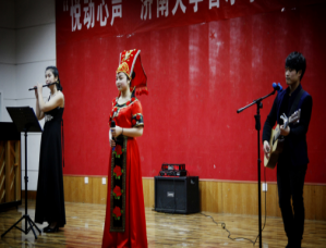 民族风情主题的第一首作品为韩鑫鑫同学作曲的《妹咬哥手定终身》,轻快旋律表现了情侣之间深厚质朴的爱情。程雪同学作曲的四川民歌《留客歌》,演唱者深情演绎了美好的友情贵如宝。何照特作曲的作品《一曲颂歌唱给您》,赞美了祖国的大好河山,表达了对祖国的满腔热情,真挚而雄伟。胡晓钰同学的作品《姊妹飞歌清水江》,具有鲜明的民族特色,动人的旋律体现了苗族人民的热情活泼。女声独唱《纳木错之恋》,将忧伤的距离化作清浅的吟咏,思念与郁结交织,令人感动。重唱《彝乡姑娘》,让人随着旋律联想到湖水明镜的如诗画面,对大凉山的赞美与喜爱也感染了每一个人。民乐三重奏曲《草原风情》,表达美好风光与向往之情。欣赏古筝独奏 《小河淌水随想曲》,抒情委婉,情感细腻,令人陶醉。民族风情主题在经典作品《茉莉花》合唱中结束。