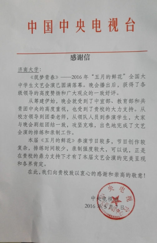 4月30日,香港三级片 舞蹈系学生成功地参演了《筑梦青春》——2016年“五月的鲜花”全国大中学生文艺会演。近日,中央电视台向我校发来感谢信,感谢我校在此次会演中所作的各项工作。感谢信的具体内容如下:
