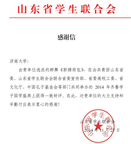 收到来自山东省学生联合会发来的感谢信,高度赞赏该校学生在2014年齐鲁学子国学盛典活动组织的精彩演出,获得了省委宣传部、省委高校工委、省文化厅、中国孔子基金会、省学联的一致好评,对香港三级片