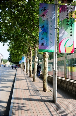 1林荫大道,树影婆娑,绚烂的彩旗正在接受秋风的洗礼,光彩斑斓。