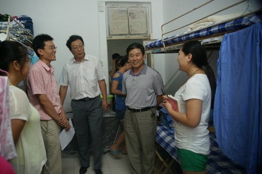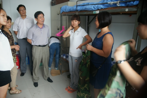 党委书记赵道会带领学工人员和新生班主任到新生宿舍查看新生住宿环境,确保新生能住的安心、舒服,并且与新生进行了简短的交流,希望他们能够尽快适应校园的集体生活,希望他们以饱满的热情积极投入到大学生活中来。另外,也向新生强调了宿舍环境的重要性,希望新生能够培养自己的主人翁意识,营造温馨和谐的生活学习氛围。