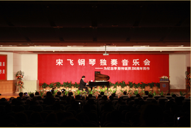 李斯特(1811年10月22日——1886年7月31日),匈牙利作曲家、钢琴家、指挥家,浪漫主义音乐的代表人物之一,被人们誉为“钢琴之王”。李斯特诞辰200周年,是一个纪念,也是一种回想。1826年,十五岁的李斯特完成十二首练习曲,最后成为著名“超技练习曲”最初的版本,亦称为“超技练习曲”,为高级音乐会练习曲。在音乐会的开始,宋飞老师以娴熟扎实的演奏技巧分别演奏了《f小调超技练习曲》、《降D大调超技练习曲“夜之和谐”》、《d小调超技练习曲“马捷帕”》,充分展现了李斯特非凡的创作才华和极具想象力的音乐语言;从某种意义上说,音乐是精神的回响,被视为李斯特音乐自传的《b小调奏鸣曲》表达了李斯特严肃、沉重的情感,概括了他一生的思想。宋飞老师用心灵倾情演绎了李斯特的这首《b小调奏鸣曲》,使得人们在当今这个无比喧嚣的环境里,对古典音乐充满了向往;狂想曲是李斯特独树一帜的音乐体裁,《匈牙利狂想曲》是由李斯特所写的一组钢琴曲目,全组19首曲目都是以当时匈牙利民歌音调为主题,并于1846—1853年、1882年以及1885年期间所编写。宋飞老师最后演奏的《a小调第十三号匈牙利狂想曲》酣畅淋漓,不同凡响,弥漫着华丽、辉煌的气息,充分展露了李斯特“钢琴英雄”的风度,雄大的气魄和细腻的诗情交相辉映,突出了李斯特在创作中流露出的柔情与冥思。