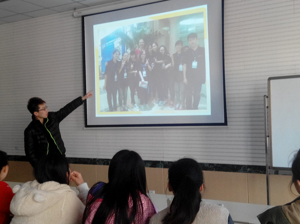 团会伊始,团支书让同学们写下令自己感到幸福的事情,让同学们通过交流认识到在自己身边那些微不足道的小幸福。然后使用投影展示了在“第18届国际钢琴制造技师调律师年会志愿者”活动中,学生与老师一起在杭州拍下的温馨照片。大家沉浸在那些一起活动、游玩的温馨照片中,脸上都洋溢着幸福的笑容。接下来,团支书播放了关于友情的视频,带着同学们回忆那些简单而美好的友情,大家聆听着,感受着,相互交流对于“幸福”的看法。最后,全体同学一起做游戏,一起玩如同综艺节目上的“谁是卧底”,大家互相介绍着,言语间充满了幸福,欢乐充满了整个教室。