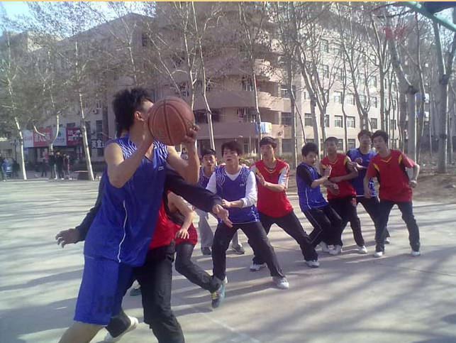 篮球队在学校篮球场展开了一场激烈的篮球友谊赛。