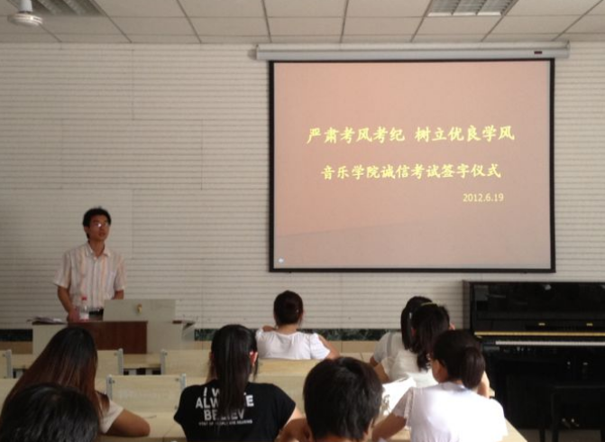 于6月19日中午在多媒体2举行诚信考试动员大会签字仪式。出席此次签字仪式的有团委书记高学德、辅导员朱孟斐老师。签字仪式由高学德老师主持。