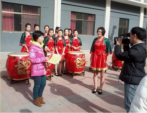 的宣传栏、排练室,随后进行了《中国龙》的拍摄工作。铿锵的鼓点,敲出了磅礴气势,演员激扬动感的表演把《中国龙》演绎的淋漓尽致。表演结束,主持人对鼓乐队队员进行了专门采访,对同学们不畏严寒精彩的表演表示由衷的感动。同学们则表示虽然排练和演出比较辛苦,但作为音乐表演者,舞台就是自己的天地,技艺就是立身之本,以后还会严格要求自己使专业技能和舞台表演得到进一步提高。最后,节目组为鼓乐队颁发了“鼓舞泉城”活动的荣誉证书。