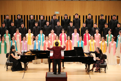 “山东泉城合唱团”指导教师田浩担任指挥,由学校团委副书记胡春毅主持。上半场,开场曲《大豆白米花生》,采用半音乐剧的形式,为大家呈现了京杭大运河开通后京都商业街的热闹场景;《如梦令》配以含蓄婉约的琵琶伴奏,民族调式配合古典诗词,尽显民族音乐之美;《城南送别》用大家都熟悉的旋律铺垫展开;《wangol》和《balleilakka》两首外文作品活泼生动,欢快的曲调配合着打击乐与合唱团员们熟练的舞步,新颖欢快。下半场,师生共同演绎了具有我国近代合唱里程碑意义的大型音乐作品典范之作——《黄河大合唱》。《黄河大合唱》是一部展现民族精神的气势恢弘的音乐巨作,是一部影响深远的国家史诗,谱写了中华民族不屈不挠的战争史和自强不息的民族英雄气节。师生们以饱满的热情和昂扬的志气,以黄河为背景,热情歌颂中华民族源远流长的光荣历史和中华民族坚强不屈的斗争精神,传递团结凝聚的爱国主义情怀和时代正能量。