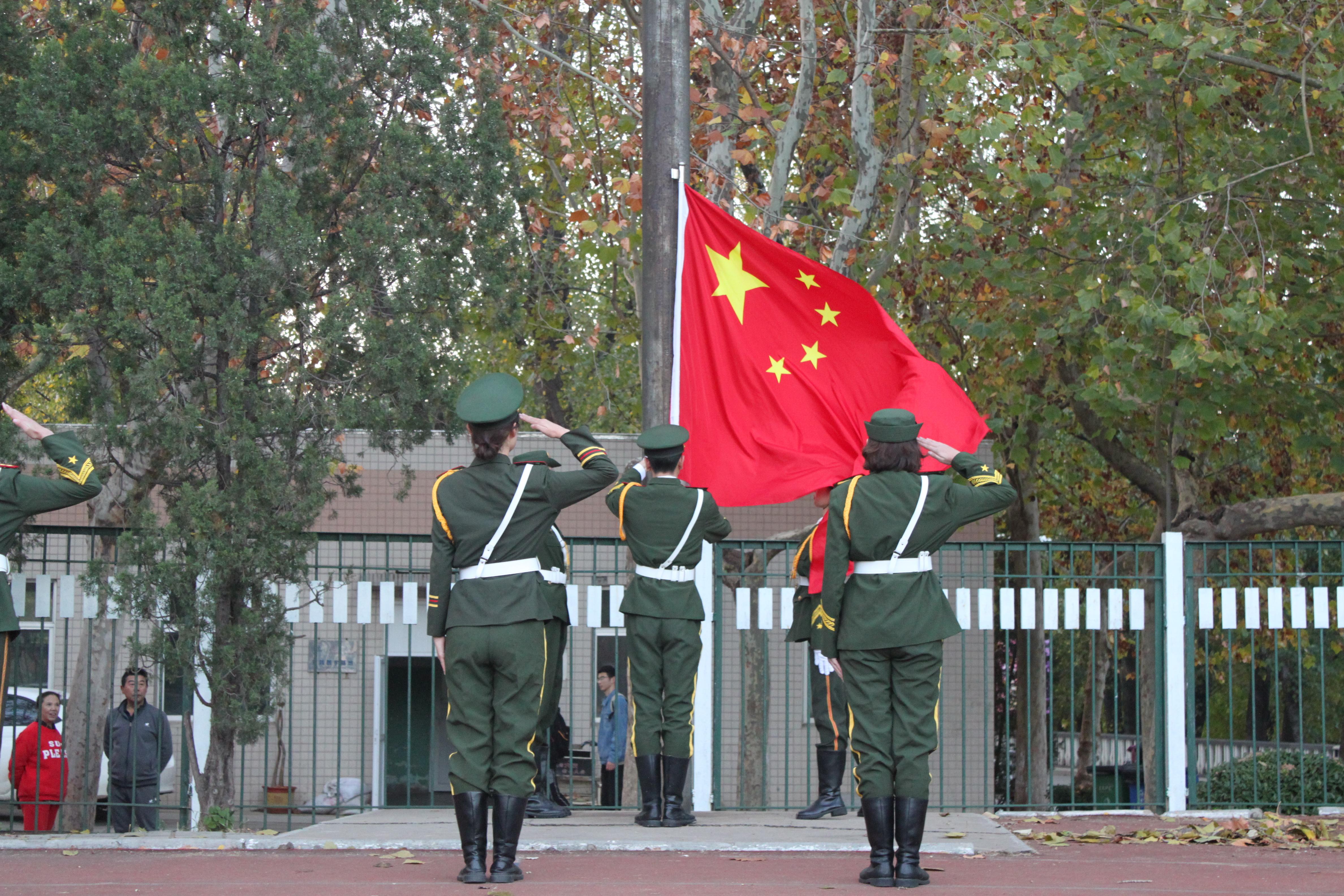 迎着初晨的朝阳,英姿飒爽的国旗护卫队成员身着绿色戎装,精神抖擞的踏着正步,托举着鲜艳的五星红旗缓缓入场。行礼完毕,伴随着庄严的国歌,五星红旗冉冉升起,迎风飘扬,在场全体师生向国旗行注目礼。香港三级片