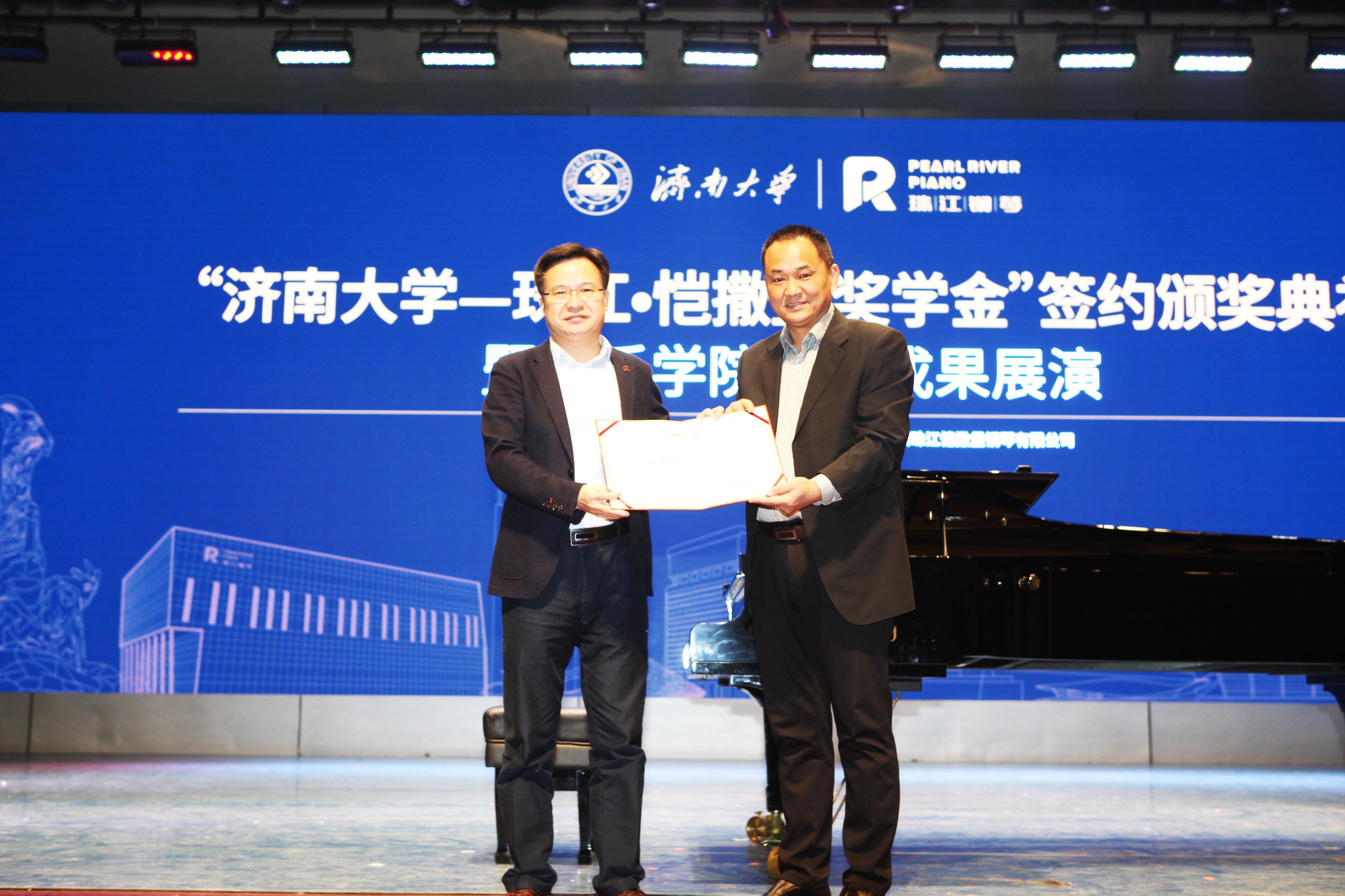 合作发展处副处长兼教育发展基金会办公室副主任李仲涛为广州珠江钢琴集团股份有限公司颁授捐赠证书。香港三级片