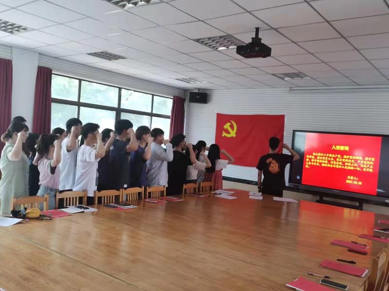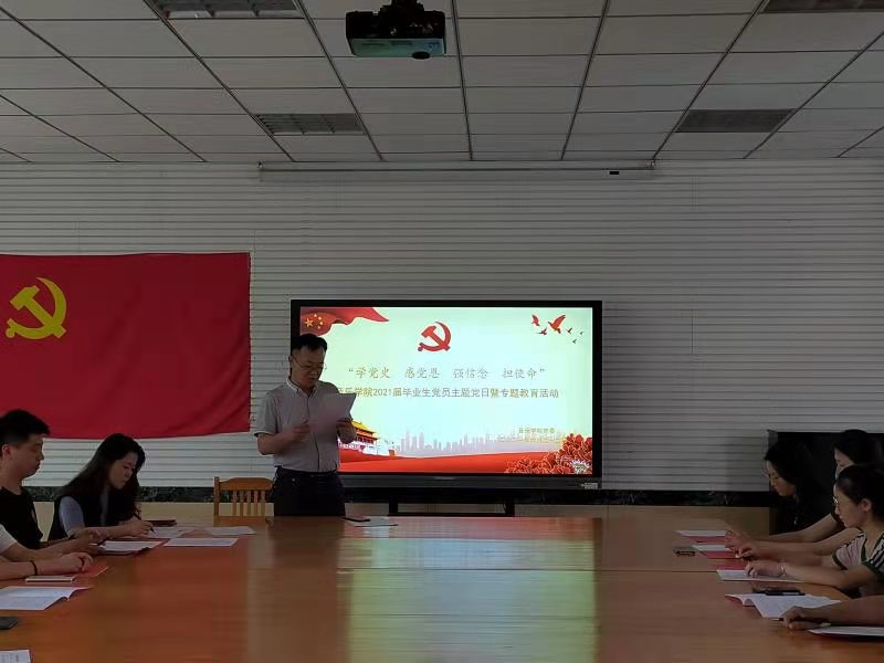领导老师同全体毕业生党员一起面对党旗重温入党誓词,学生党支部书记马媛老师就毕业党员组织关系转接等工作做了具体安排。