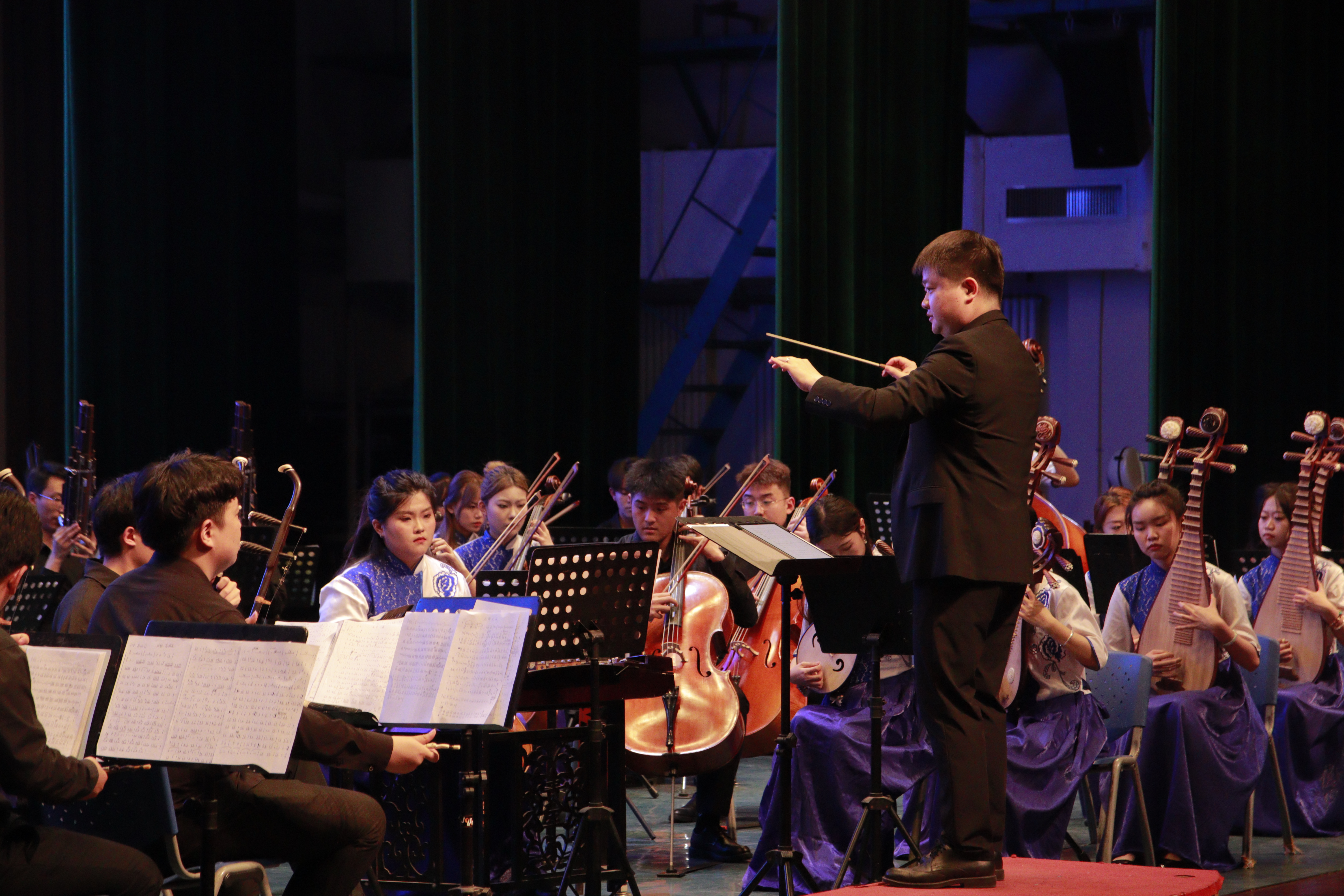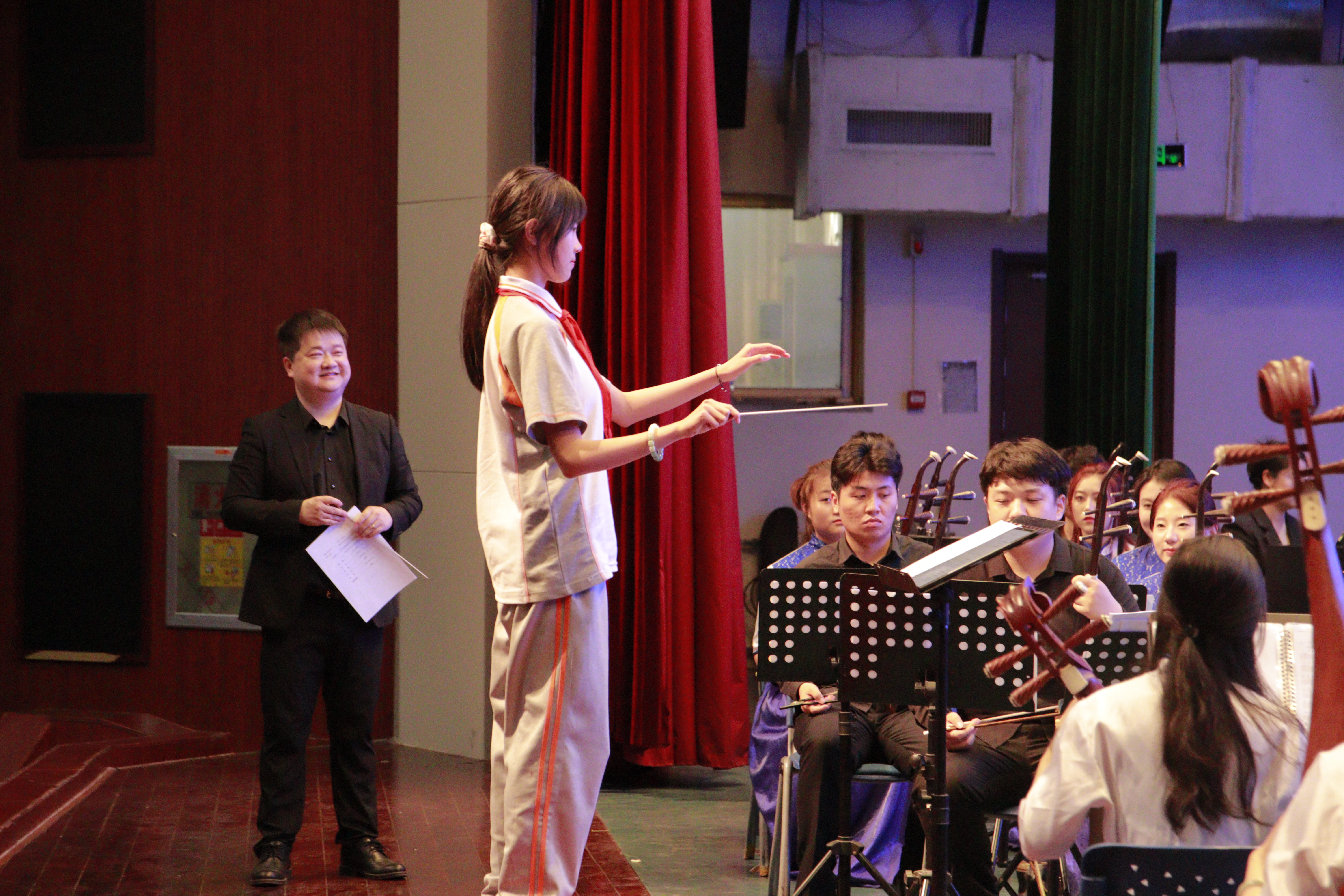 青年教师田浩担任此次音乐会指挥,以寓教于乐的形式介绍中国传统器乐及作品,让中小学生更多的了解民族管弦乐队不同声部的乐器,用舞台互动激发了学生对民族乐器学习的热情,让艺术与文化融入学生的生活,弘扬中华文化经典底蕴。