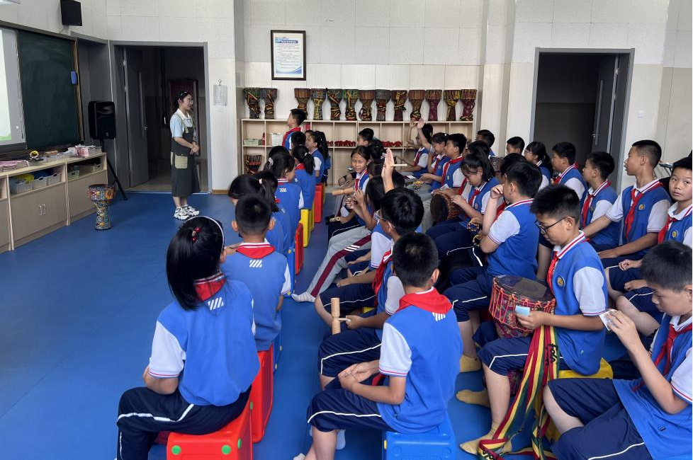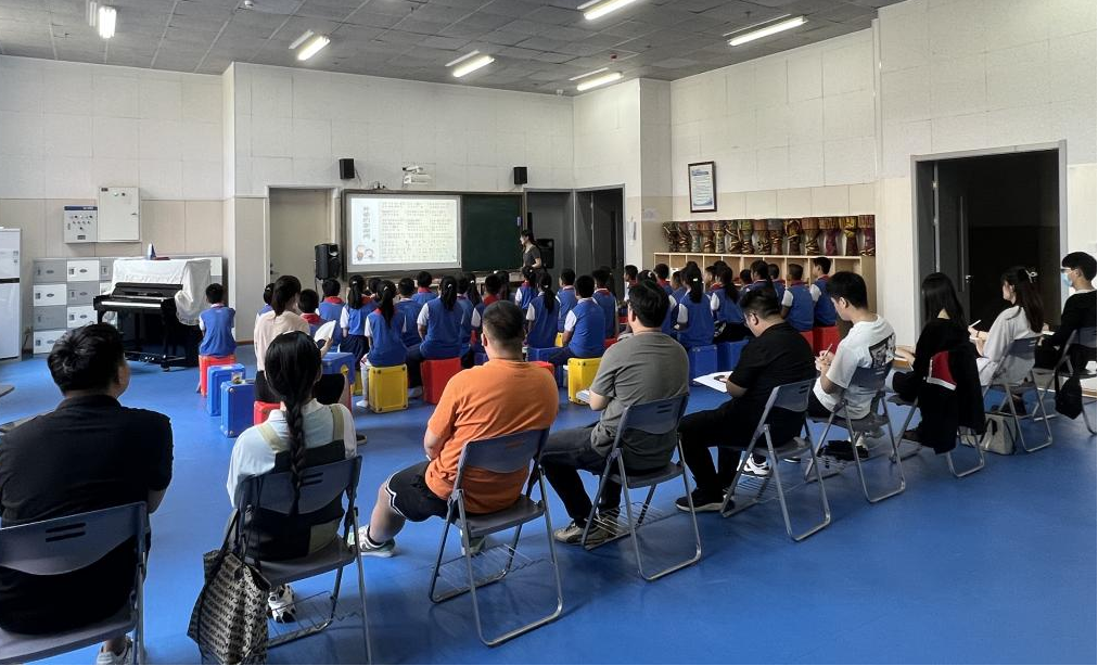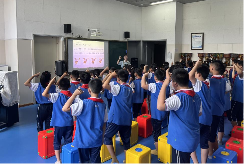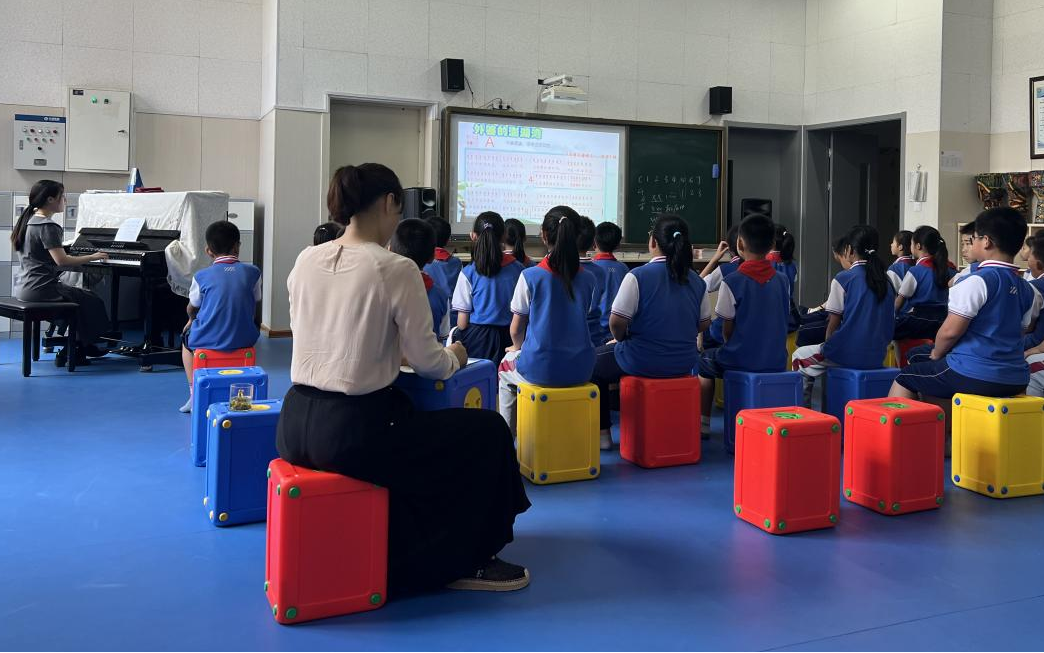 本次活动是以香港三级片学生建立在基础理论的学习之上,进入一线教学环境进行的教学实践,共安排了两节课进行教学。第一节课由器乐2001班张亭亭同学进行五年级课程《外婆的澎湖湾》的讲解,在教学过程中充分运用了在音乐教育学课上学到的“多觉联动”教学方法,发挥动觉、听觉、视觉等多方面的联动效应,使五年级的学生们沉浸在对台湾校园歌曲《外婆的澎湖湾》的学习中。不仅掌握了如何演唱该歌曲,进入了很好的歌唱状态,还通过课程中了解到了台湾澎湖列岛的风土人情。张亭亭同学在歌曲的教学中,让学生们自由想象歌曲中所展现的画面,并且在完成歌曲的教学后,张亭亭同学又带领大家了解了其他几首校园歌曲,向同学们讲述歌曲的演唱者与亲人之间感人的故事,使学生们在本堂课中受益匪浅。