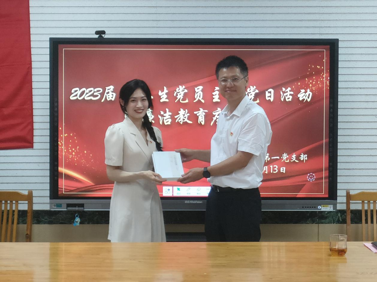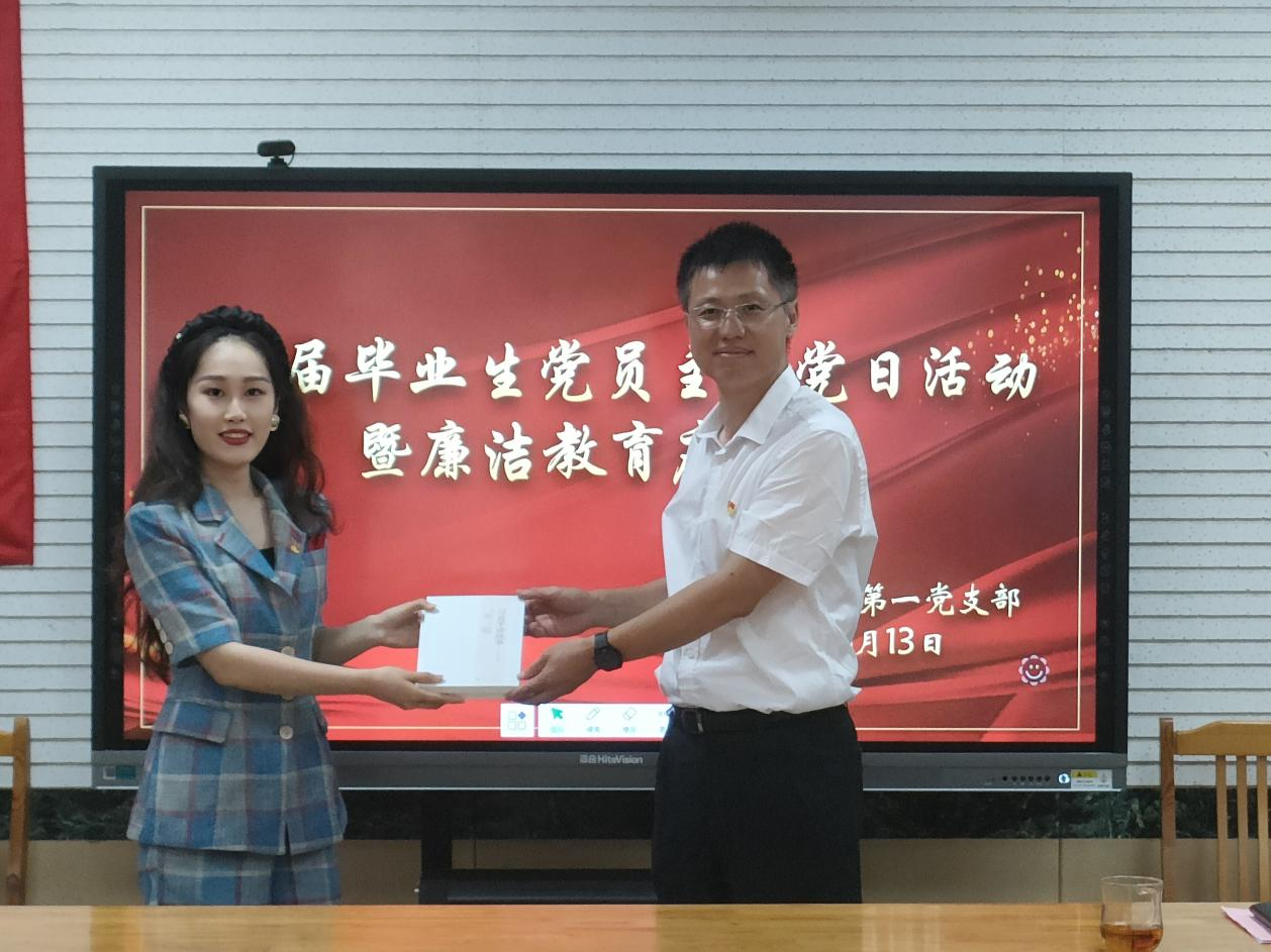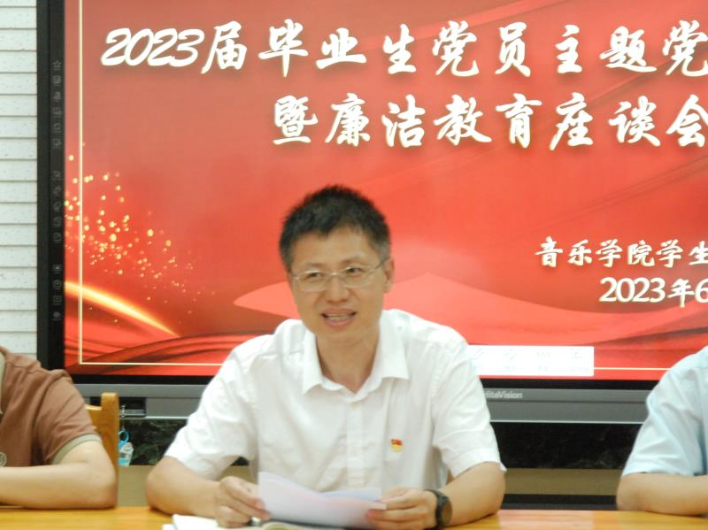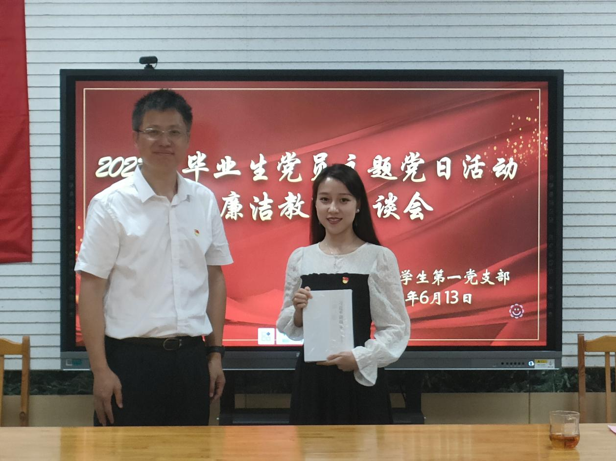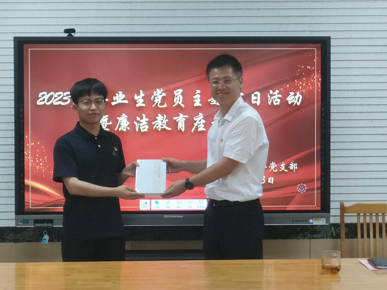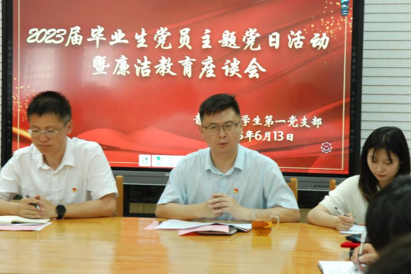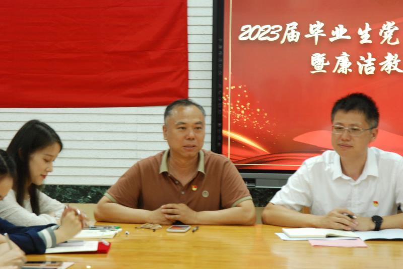 党委副书记、副院长郝伟为毕业生党员做廉洁教育。古人云:贪如火,不遏则燎原;欲如水,不遏则滔天。他强调,身为一名党员,要有着廉政、廉洁、自律的品质,并告知大家淮海战役的胜利,正是因为解放军有着廉洁、自律的优秀品质,所以才出现了“军爱民,民拥军”的局面。同时,郝伟对毕业生党员提出了几点要求:首先,要知敬畏,要有纪律意识和规矩意识,时刻保持清醒的政治头脑,牢记全心全意为人民服务的宗旨;其次,要守底线,要保持政治底线,在学习、生活和工作中要做到“不以恶小而为之,不以善小而不为”。最后,他对毕业生党员送上了美好的祝福,祝福大家大展宏图,鹏程万里。