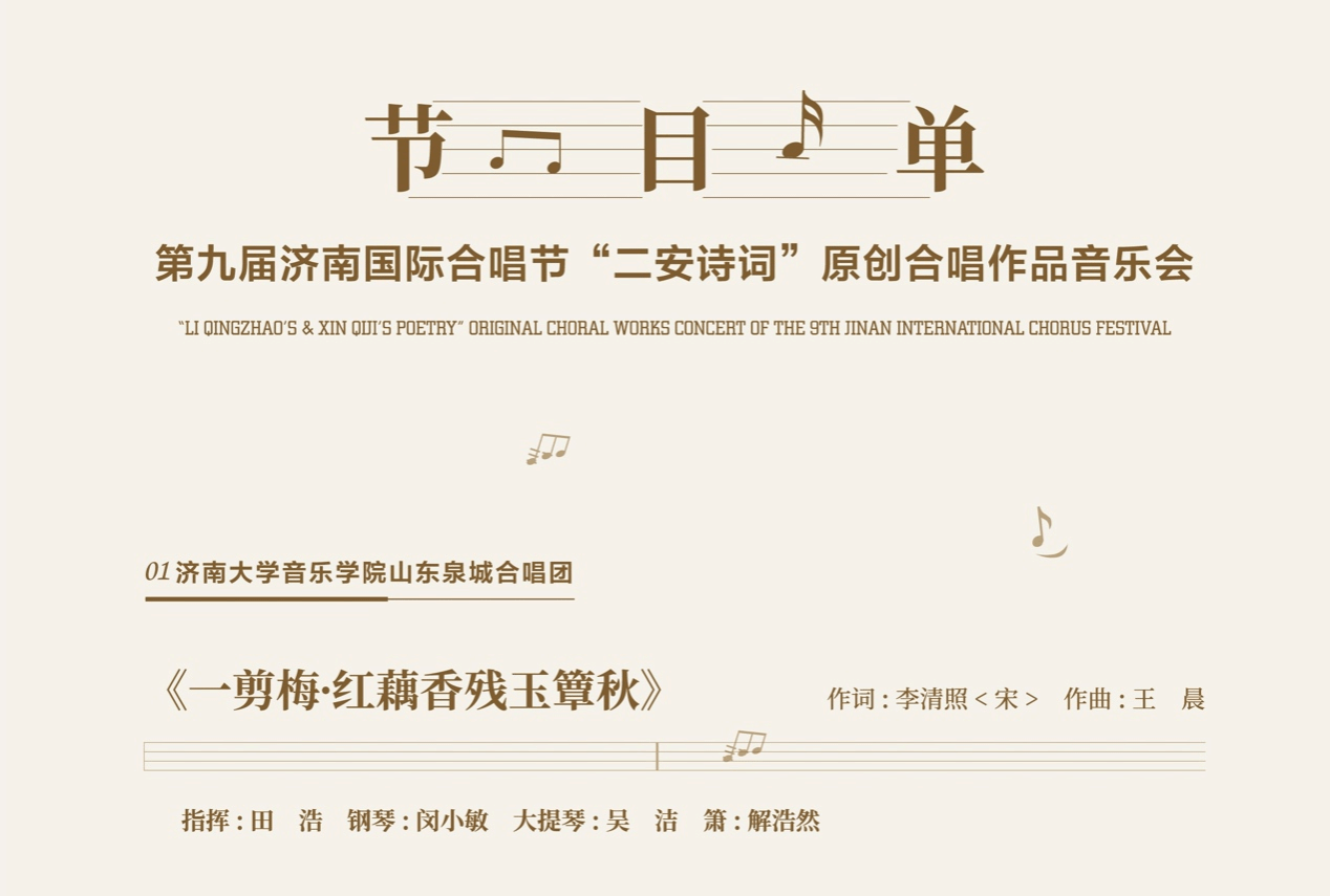在此次合唱节中,香港三级片青年教师田浩老师指挥、闵小敏老师担任艺术指导,同时在解浩然同学的助演下,合唱团完美演绎了由王晨作曲的《一剪梅·红藕香残玉簟秋》,这是李清照新婚燕尔思念丈夫赵明诚写下的一首词,婉转含蓄,唯美隽永。全词以花喻人,一气呵成,将瞬间情绪付诸笔端,展现易安词独特之美。