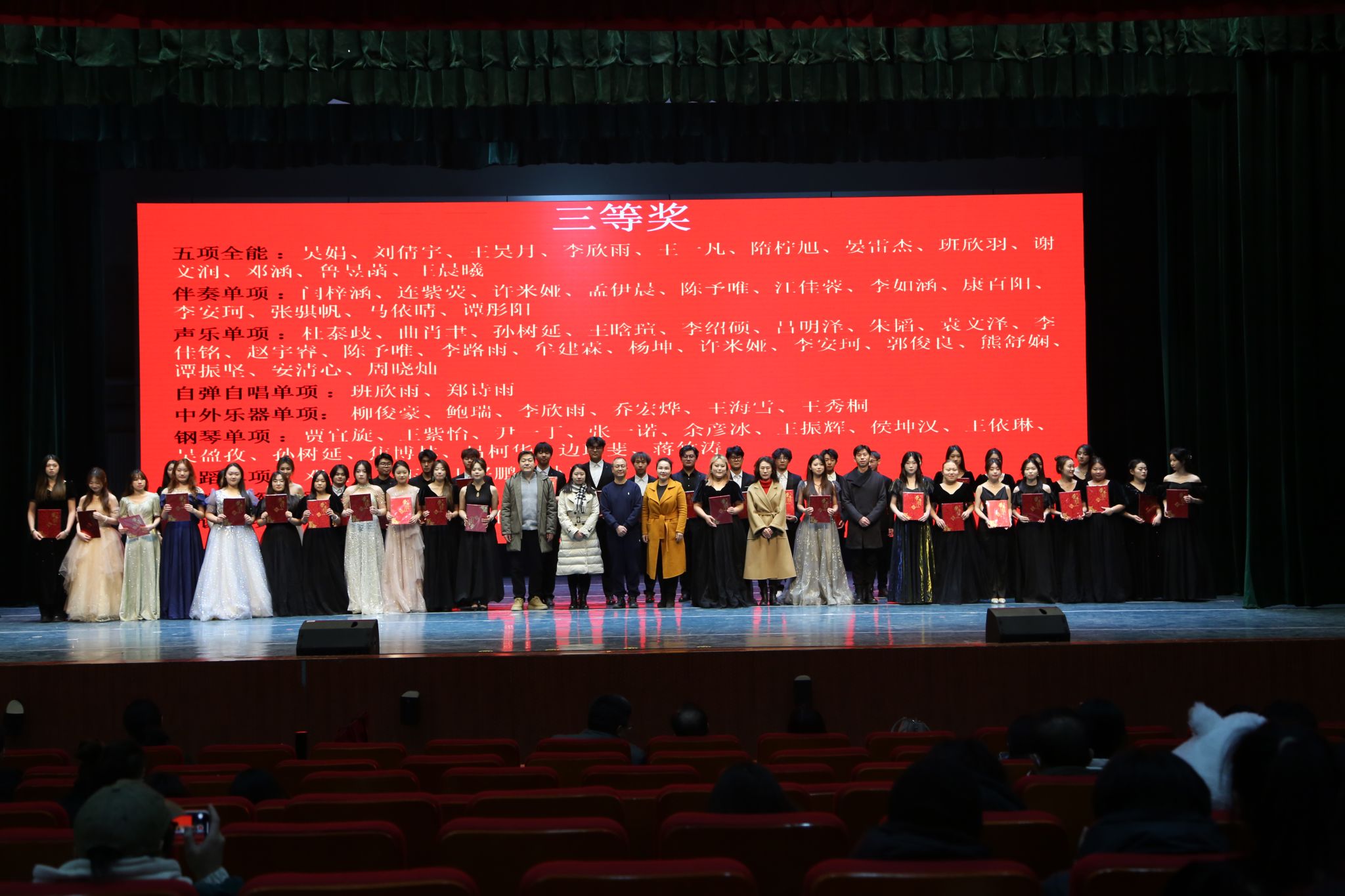 班子成员以及系主任,分别为荣获全能组、单项组一、二、三等奖的同学们进行颁奖,并一同合影留念。