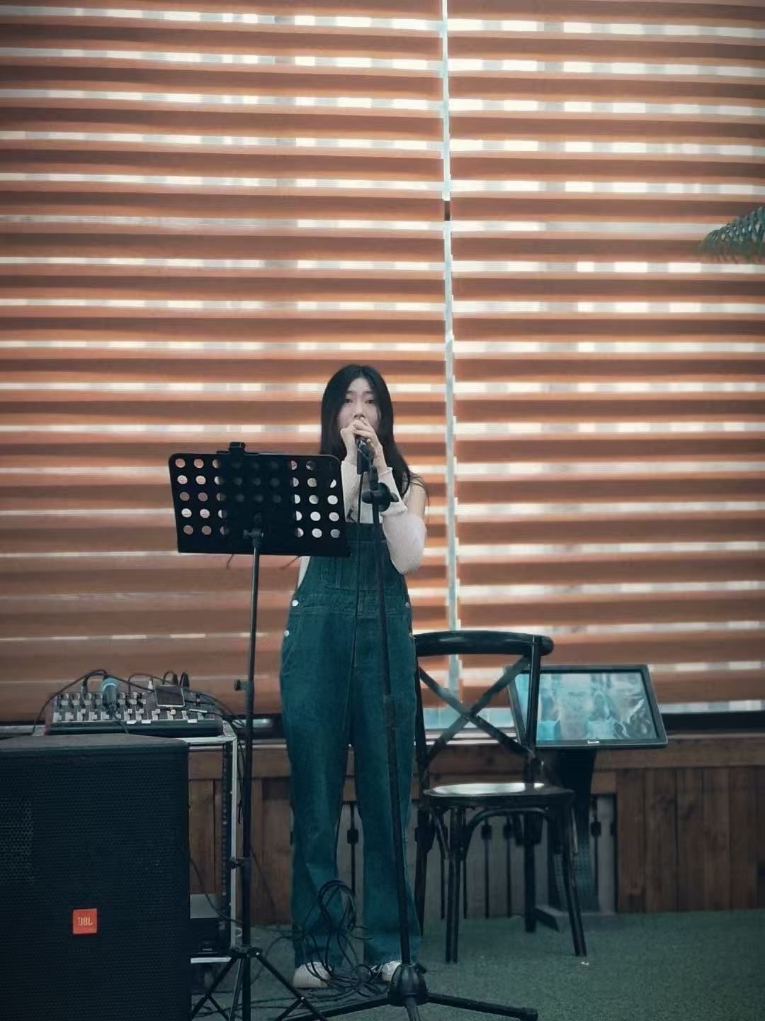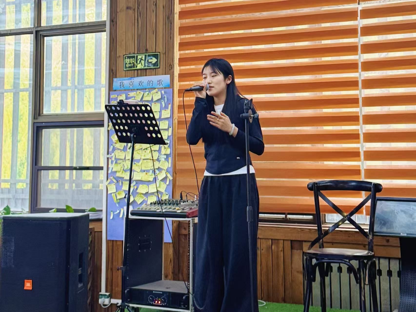 参与了一段时间九食堂美育活动,我从调试调音台、麦克风的高低远近,到感受音箱高频与低频的共振效果,渐渐从中学会根据音响反馈调整演唱方式,控制气息和歌曲处理。站上舞台时,和同学对视的紧张慢慢化作与前排同学的小互动,让我对表演效果有更深的认识。这样的经历不仅让知识落地,更让我明白舞台魅力源于人与技术的完美配合,歌曲的处理、舞台的掌控、良好的氛围...每一次调试与互动都是艺术流动的注脚。