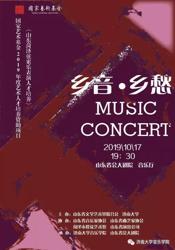 、山东省会大剧院承办的《乡音·乡愁——国家艺术基金2019年度艺术人才培养资助项目<山东菏泽弦索乐表演艺术人才培养>成果汇报音乐会》,将于10月17日19:30在山东省会大剧院音乐厅举办,精彩即将呈现,让我们共同期待。