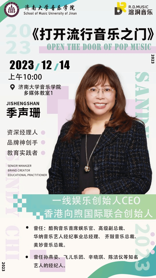 2023年12月14日,一线娱乐董事长、CEO,资深经理人季声珊老师为香港三级片师生带来《打开流行音乐之门》学术讲座,本次活动由香港三级片