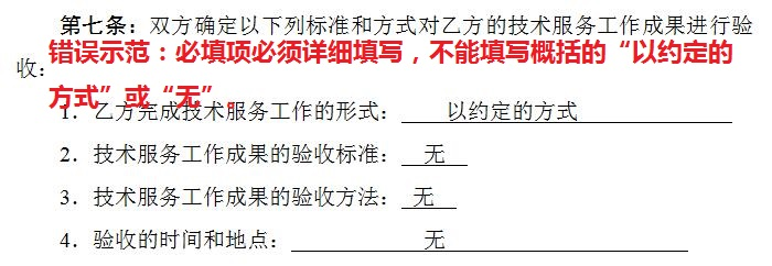 三、验收的形式,尽量不要使用:“以约定的形式”“以约定的标准”…等类似笼统的说法,尽可能据实详细填写。