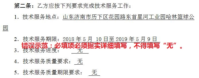 一、合同中必须详细填写,不能填写“无”或空白的内容有: