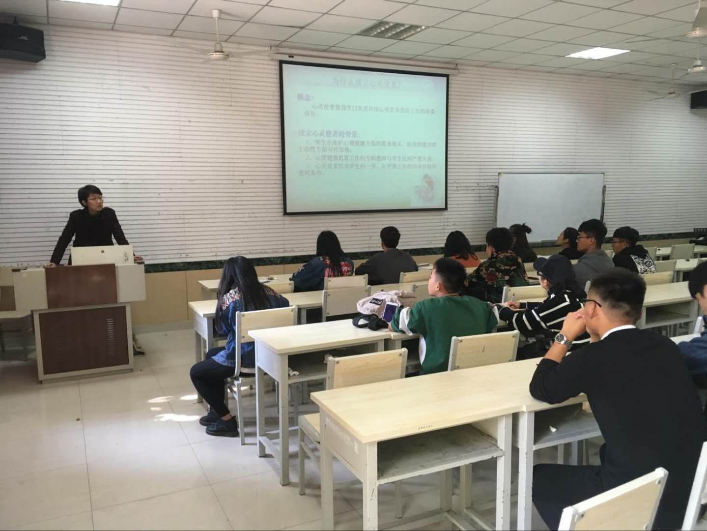 多媒体教室二举行了第六届心理协会成立大会暨心灵使者培训大会,本次会议由心协主席王慧慧主持,全体心理协会成员及2017级心灵使者参加了活动。