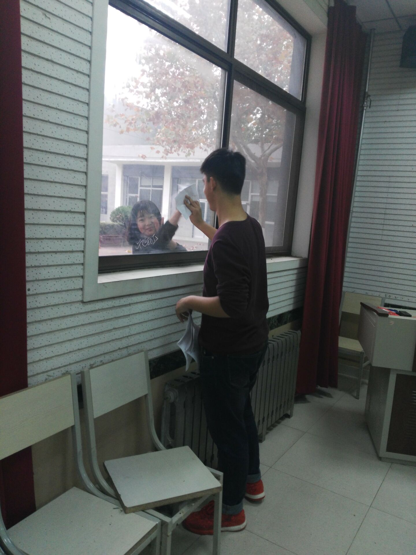 在部长们的带领下志愿者们拿着各种清扫工具在琴房楼前集合,按照分工有秩序的进行打扫。本次打扫的地址主要是琴房楼以及多媒体教室,首先是地面和玻璃的清扫,志愿者们先用扫把将地面垃圾清扫干净,随后用洗干净的拖把将地面拖干净,做到不留任何污渍,拖不掉的污渍他们用纸巾小心的在地上擦拭。用干布把窗户玻璃擦拭一遍,其次用湿毛巾把玻璃擦干净,并小心的用报纸把留下的水渍擦干净。把教室的座椅排放整齐,桌洞里的垃圾全部带走。同时用纸巾小心的将钢琴上的灰尘全部清扫干净,把每一个琴键擦的一尘不染。以便给同学们营造最好的学习环境。