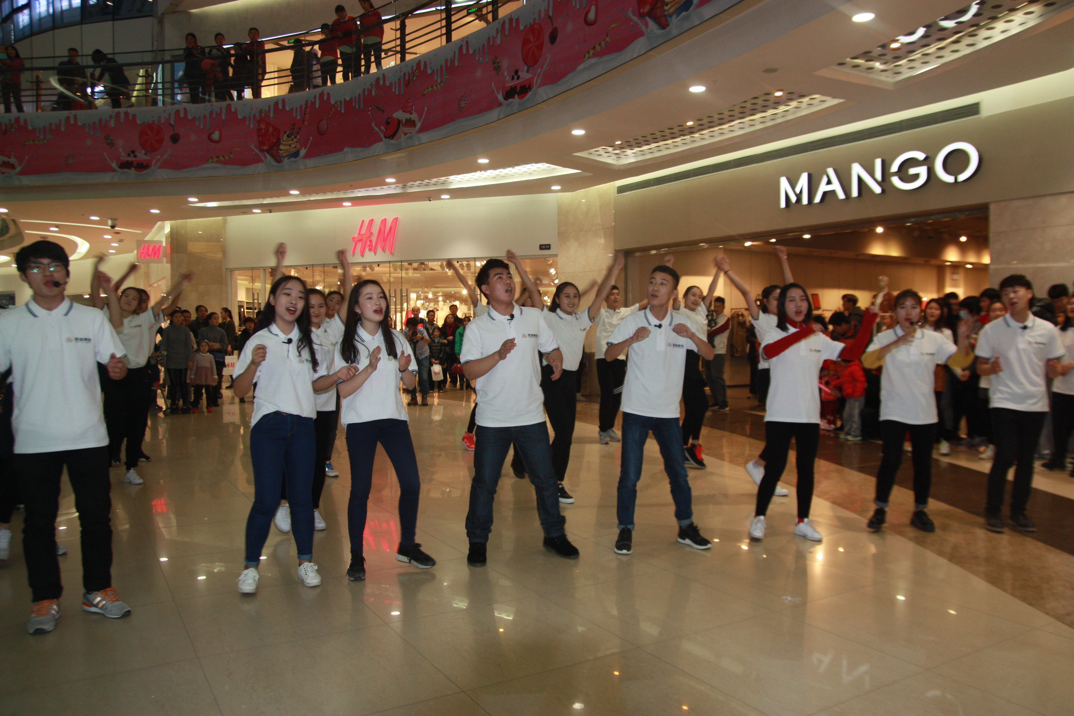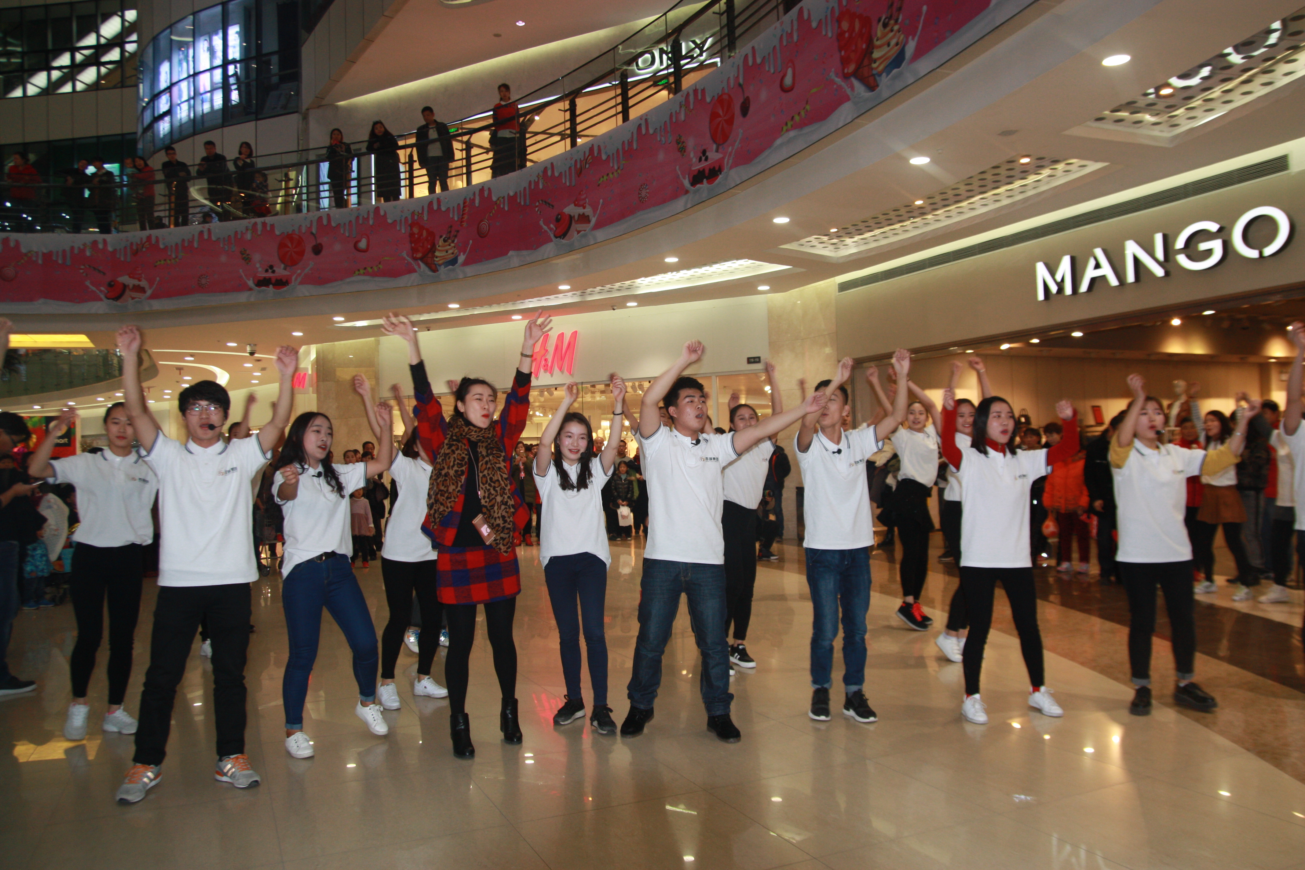 之所以叫“快闪”,是因为小伙伴们火速出现,火速撤离。人潮拥挤的商厦,在一阵欢快音乐声中,美丽的女孩们出现啦。《给力青春》的确给力,学生们优雅曼妙的舞姿,配合着动感的音乐,吸引了很多顾客驻足观望。那动人姿态赢得了阵阵掌声,随即响起了《相亲相爱》的旋律,只见帅哥美女们从四面八方活泼出现,紧接着,4对主唱也出现。“天下相亲与相爱……”在场观众也跟随旋律拍手鼓励,小孩子们更是跟着旋律在扭动。