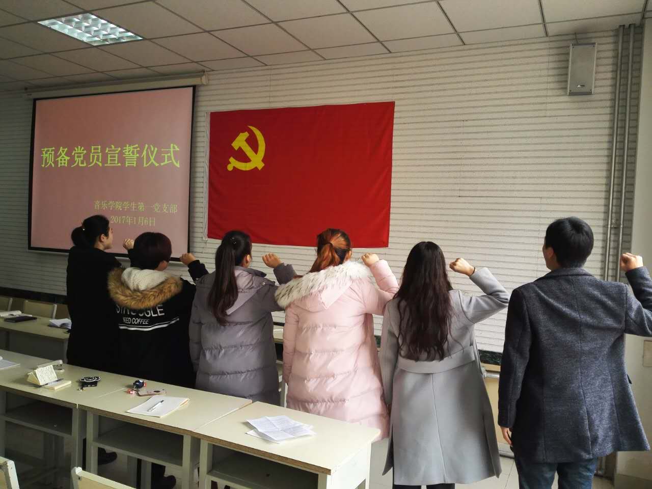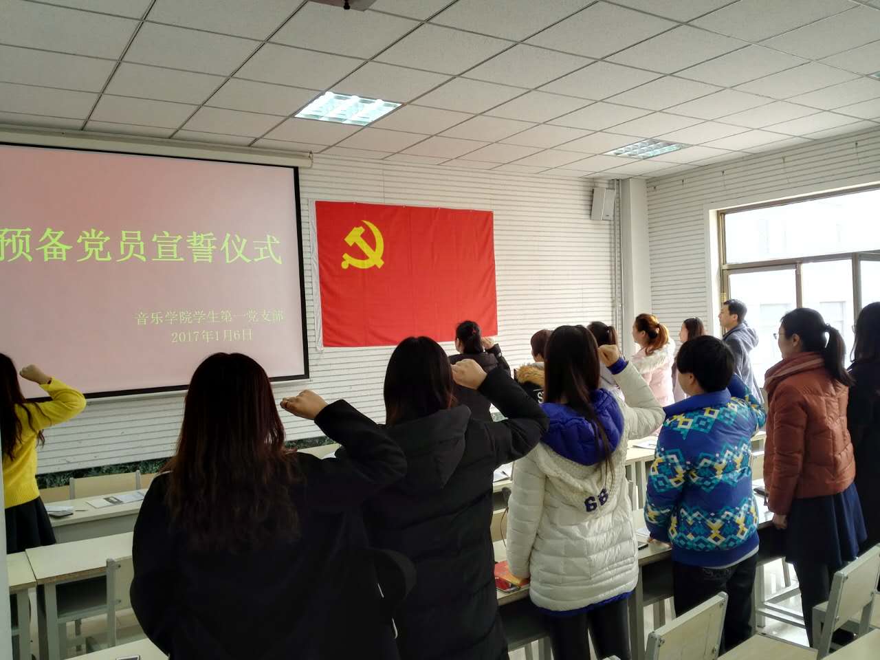 学生第一党支部在多媒体教室举行了预备党员宣誓大会。大会由学生党支部书记高学德同志主持,全体党员及预备党员参加。