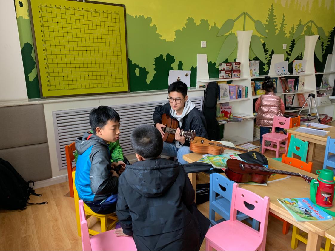 钢琴组在前半个小时中,教孩子们认五线谱、高音谱号和低音谱号以及音阶的练习。后半个小时教孩子们弹奏《欢乐颂》,通过这一个小时孩子们努力的学习以及老师们耐心的教学,孩子们的认音和乐谱的弹奏已经非常熟练。尤克里里组老师则教孩子们左手指法练习、弹奏技巧,老师也分享了自己以往的弹奏经验供孩子们参考学习,双方共同探讨,功夫不负有心人,有些孩子甚至可以完整的自弹自唱一整首流行歌曲。