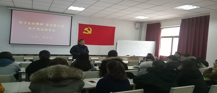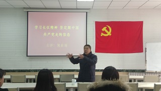 侯书记首先简要讲述了党员学习活动的意义,指出要认真学习和领会习近平总书记在十九大报告中指出的长征精神。关于毛泽东同志将红军长征概括为“长征是宣言书,是宣传队,是播种机”侯书记通过长征军人牺牲时仍握在手里的银元做党费、三个女战士给贫困村民留下的半条被子和军人为两个孩子留下的一袋干粮,而自己却饿死的这三个感人故事,将抽象的理论一下子变得生动起来。让我们充分体会到了军人身上忠于人民,为人民牺牲一切的高贵品质。接着,侯书记用自己的亲身经历告诉我们要做一个敢于担当、多为别人着想的好青年。希望党员能在实际行动中发挥模范作用,让更多的人看到党员身上的先进性。最后,要求我们学习、发扬长征精神,坚定跟党走的信念,在工作生活中严格要求自己,多为别人服务,用实际行动为伟大新时代贡献力量。